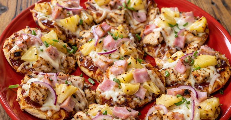 - Top it off: Evenly distribute grilled chicken, ham, pineapple, and red onion.